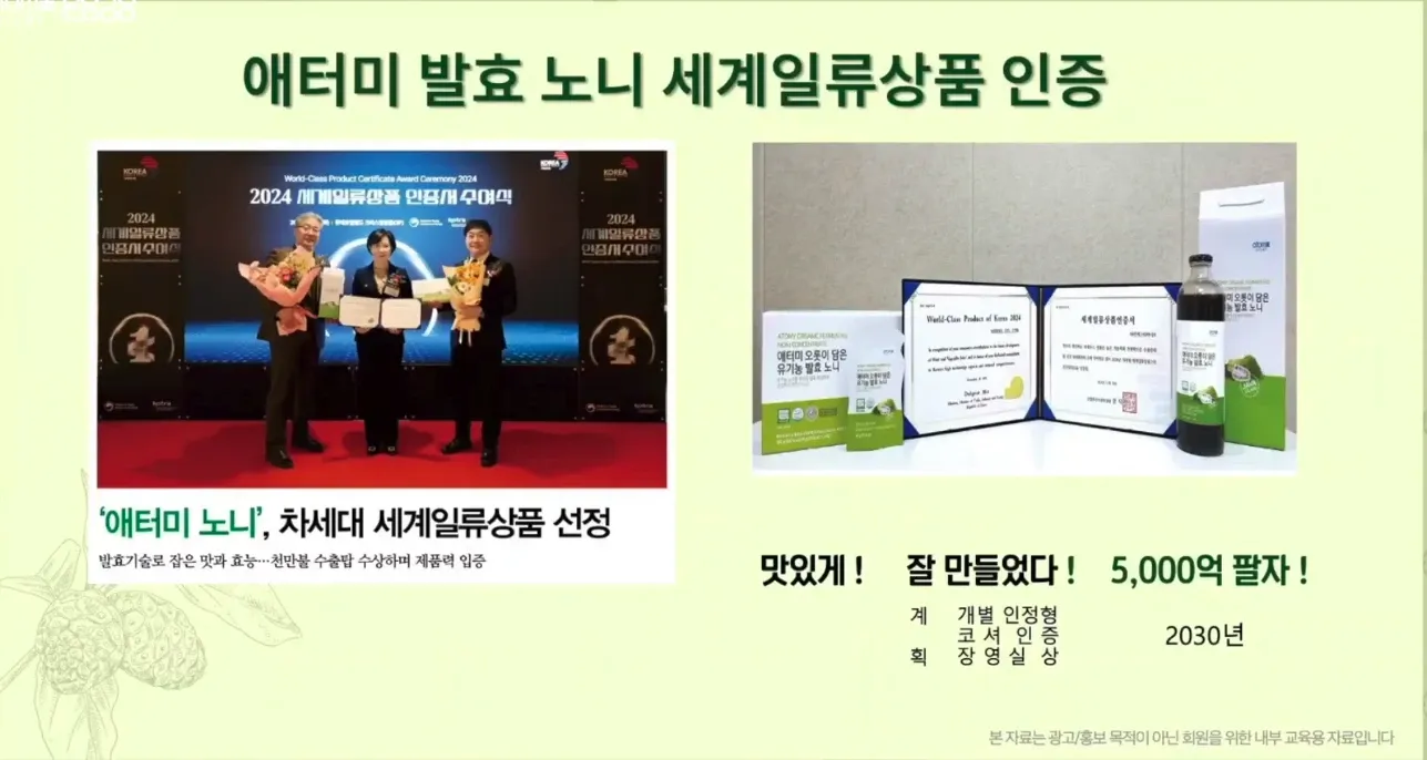 애터미 발효 노니는 단순한 베스트셀러를 넘어, 2023년 대한민국 산업통상자원부로부터 '세계일류상품'으로 공식 인증받은 제품입니다.